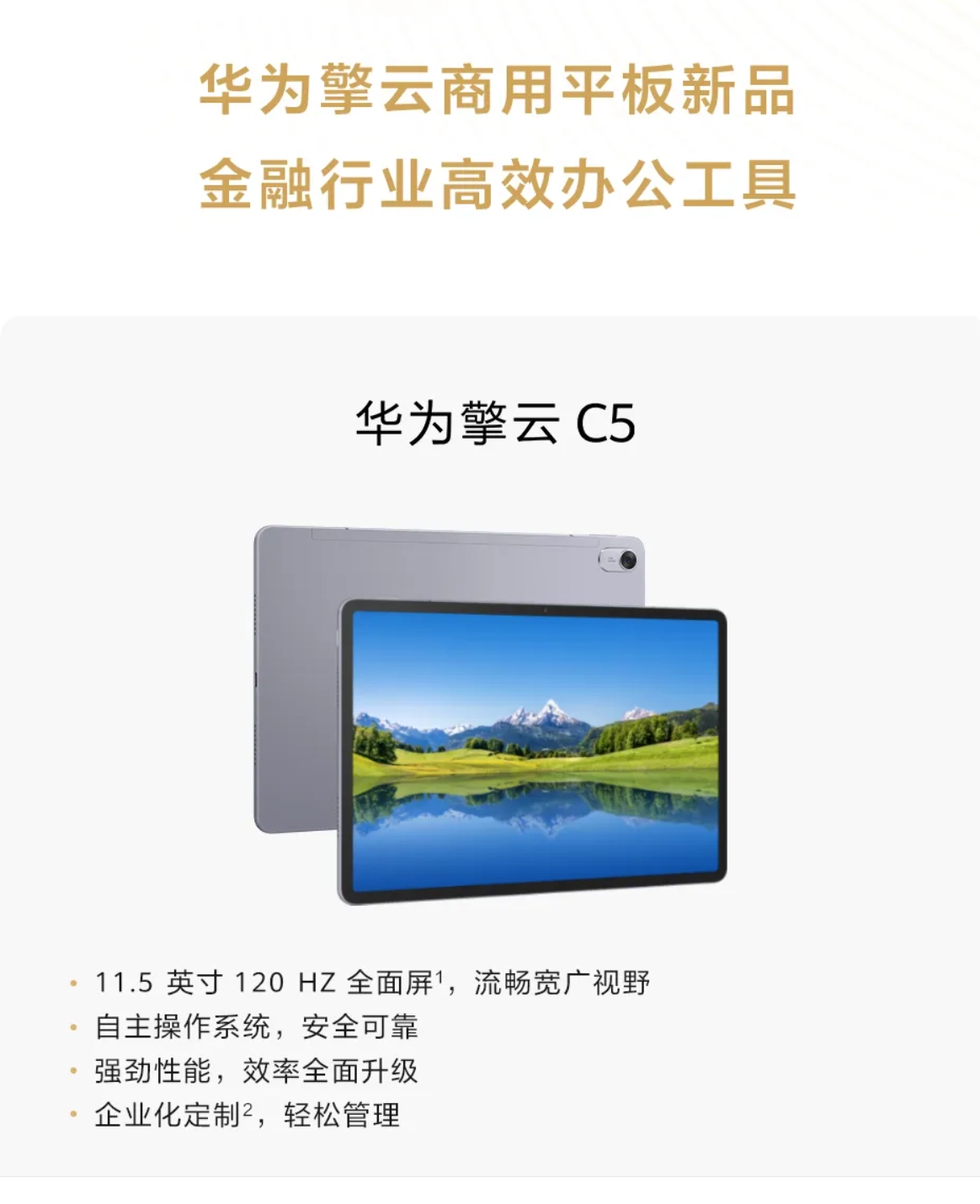 IT之家 6 月 23 日消息,据华为终端商用,新一代华为擎云 C5 将于近期上市,配备 11.5 英寸 120Hz 全面屏,搭载 HarmonyOS 操作系统。根据华为中国终端政企解决方案部部长轩君介绍,其满足架构级可信安全,可加强金融办公数据自主可控。