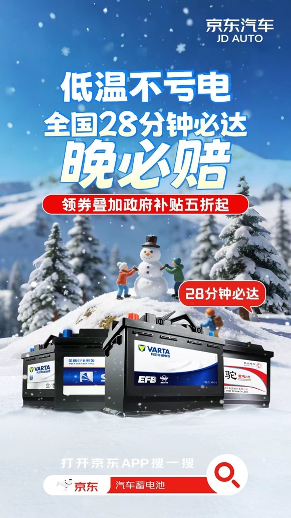 随着大范围降温降雪来袭,全国多地进入“速冻模式”,汽车蓄电池在低温下易亏电“罢工”,车辆启动难成为许多车主冬日的共同困扰。针对这一痛点,京东汽车联合瓦尔塔、骆驼、风帆三大头部蓄电池品牌,在全国升级推出“28分钟必达晚必赔”服务,活动覆盖区域用户可享下单28分钟内送达蓄电池以及专业上门安装服务,让冬季出行安心无忧。