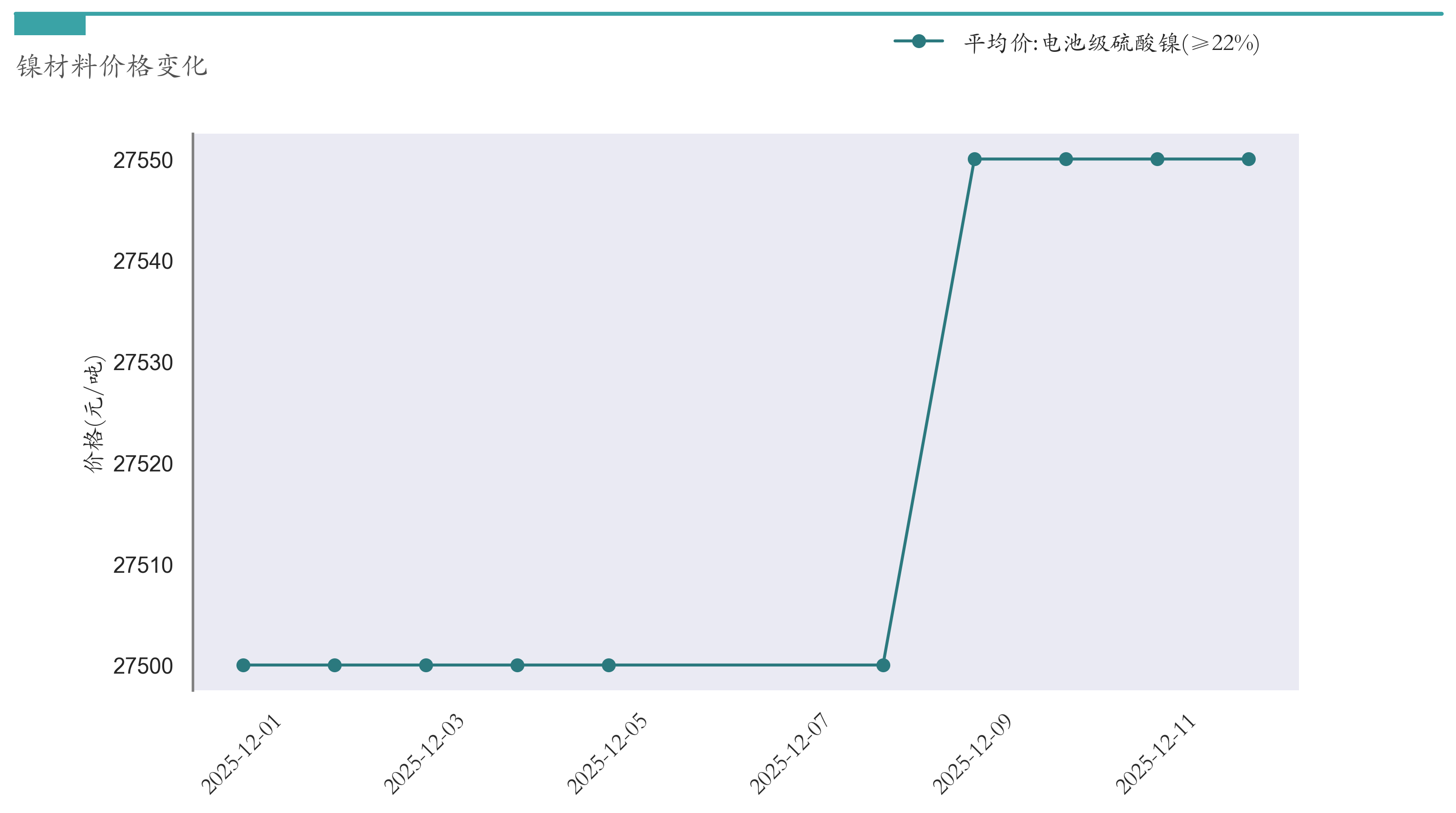 截至12月12日,电池级硫酸镍平均报价为27550元/吨,较12月5日上涨50元/吨。近两周镍材料价格变化如下图所示: