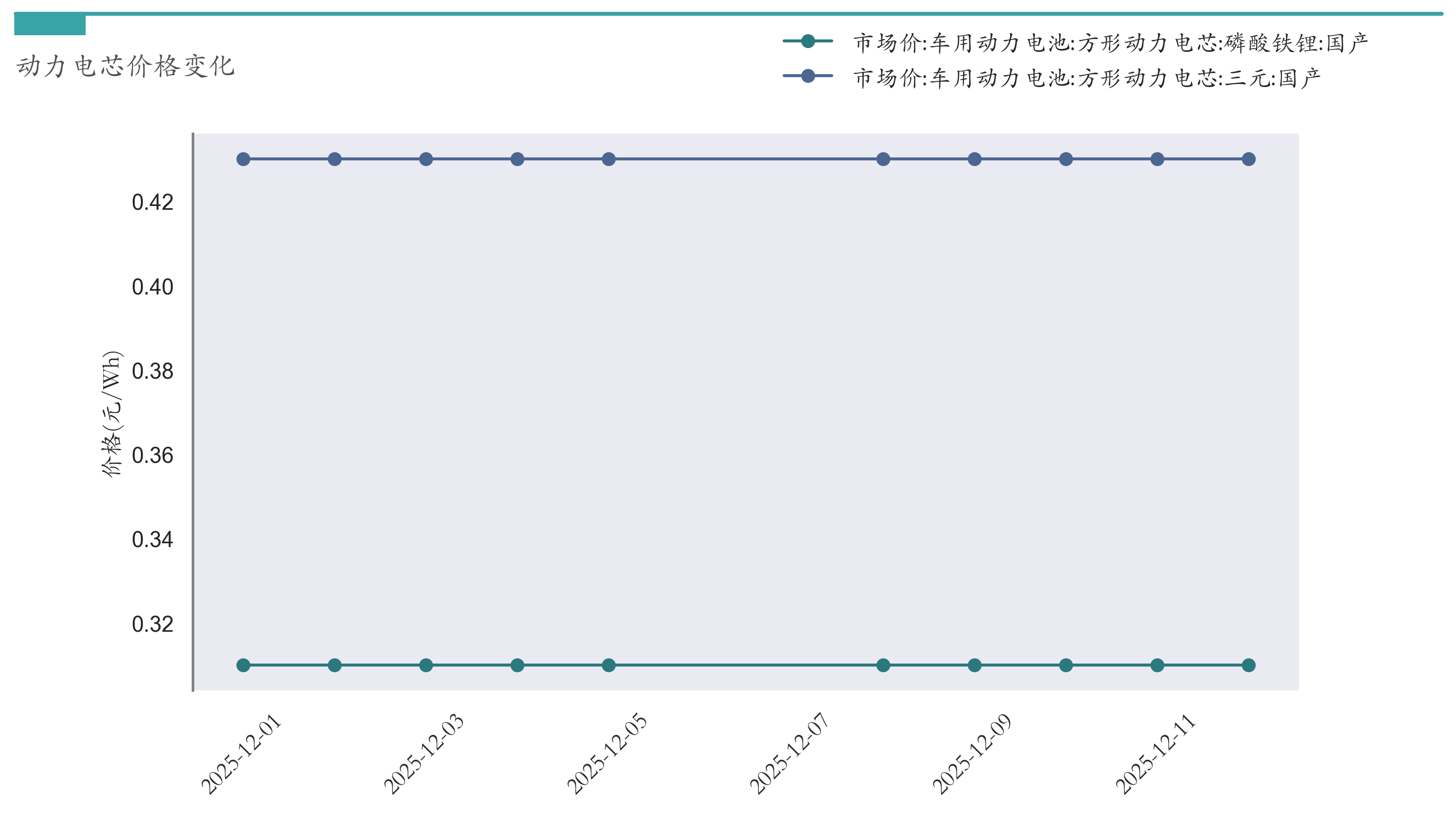 截至12月12日,方形动力电芯(磷酸铁锂)市场报价为0.31元/Wh,较12月5日持平。方形动力电芯(三元)市场报价为0.43元/Wh,较12月5日持平。近两周动力电芯价格变化如下图所示: