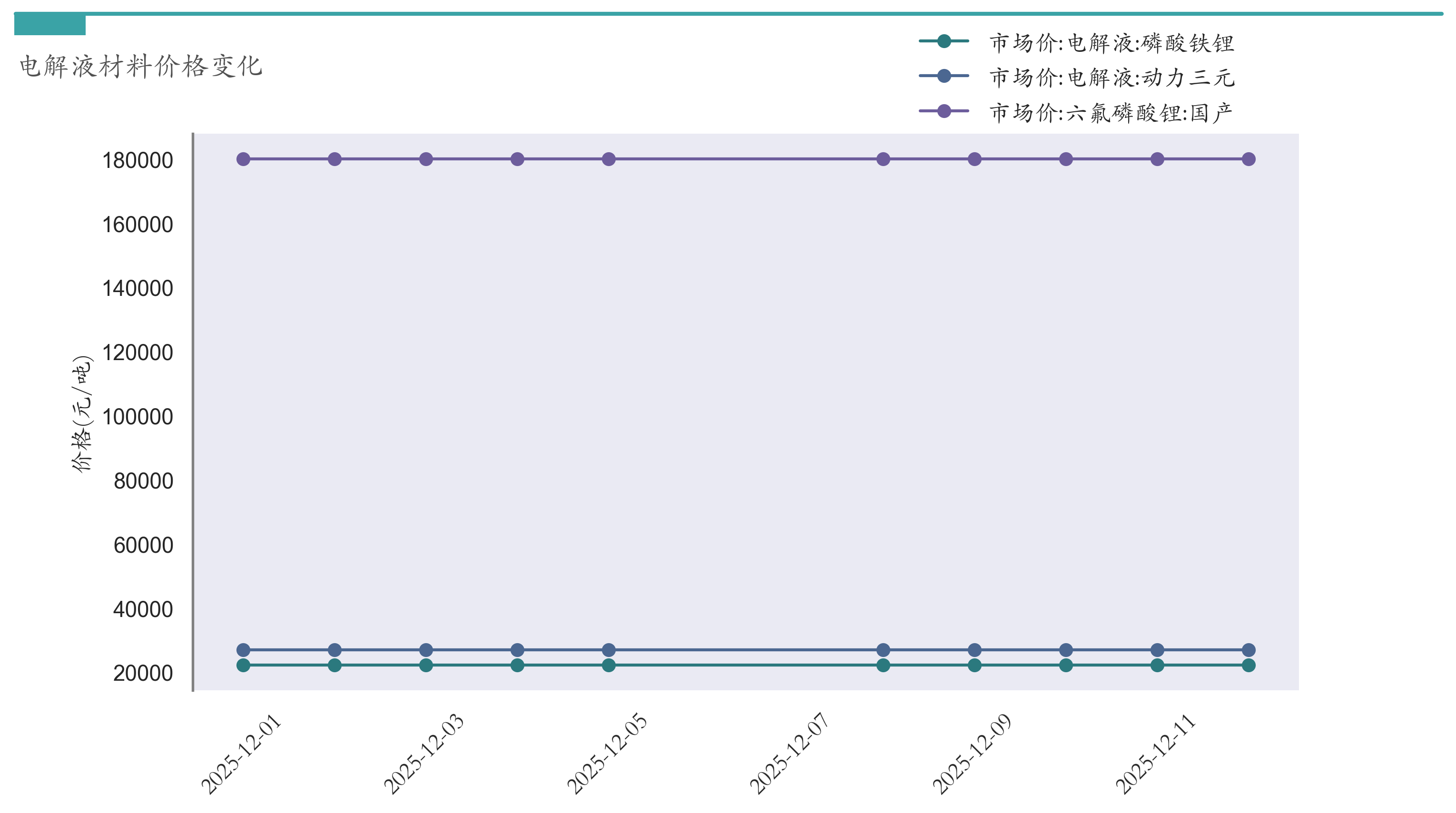 截至12月12日,六氟磷酸锂市场报价为180000元/吨,较12月5日持平。电解液(磷酸铁锂)市场报价为22250元/吨,较12月5日持平。电解液(动力三元)市场报价为26950元/吨,较12月5日持平。近两周电解液材料价格变化如下图所示: