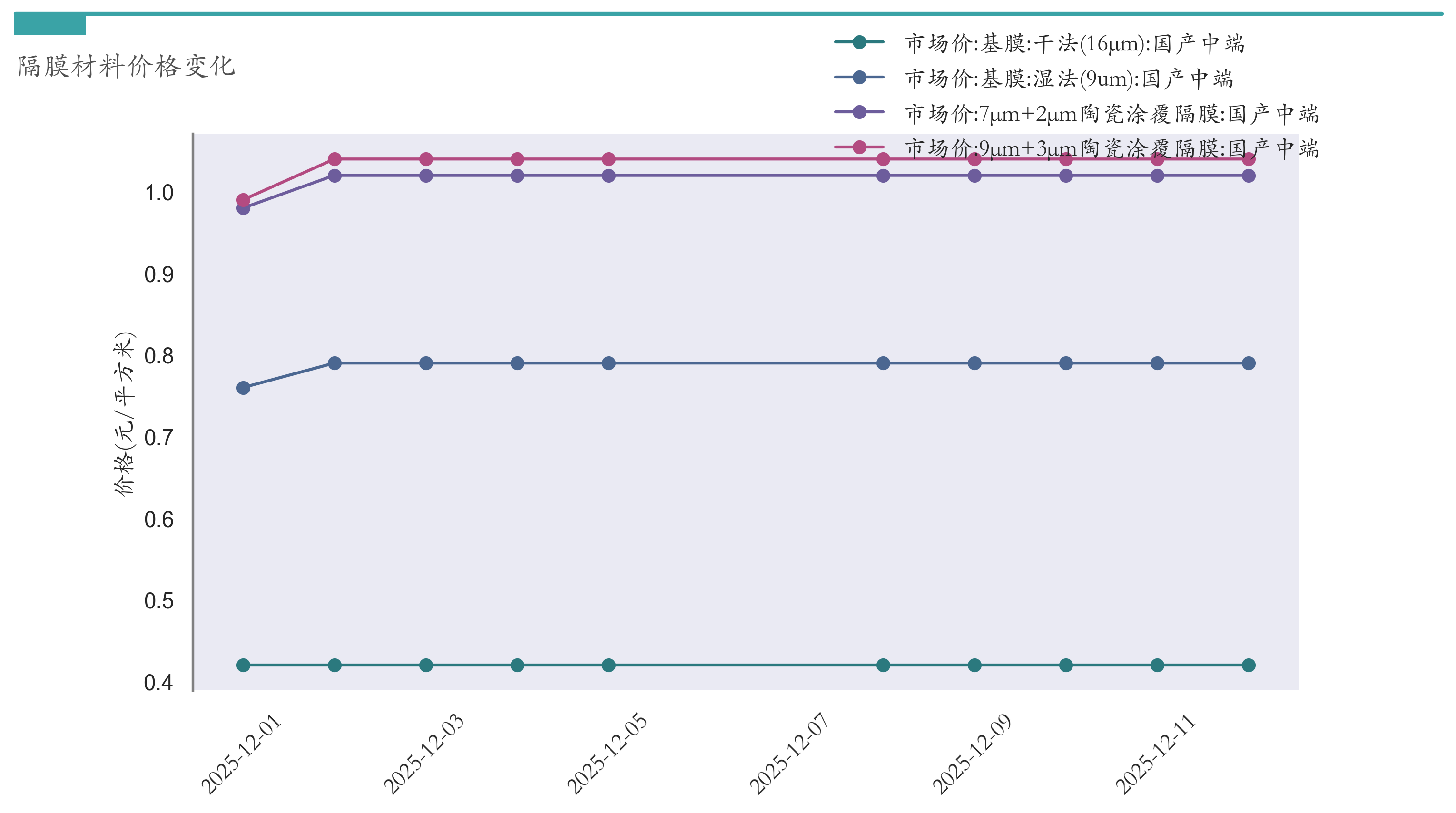 截至12月12日,干法16μm基膜市场报价为0.42元/平方米,较12月5日持平。湿法9um基膜市场报价为0.79元/平方米,较12月5日持平。7μm+2μm陶瓷涂覆隔膜市场报价为1.02元/平方米,较12月5日持平。9μm+3μm陶瓷涂覆隔膜市场报价为1.04元/平方米,较12月5日持平。近两周隔膜材料价格变化如下图所示: