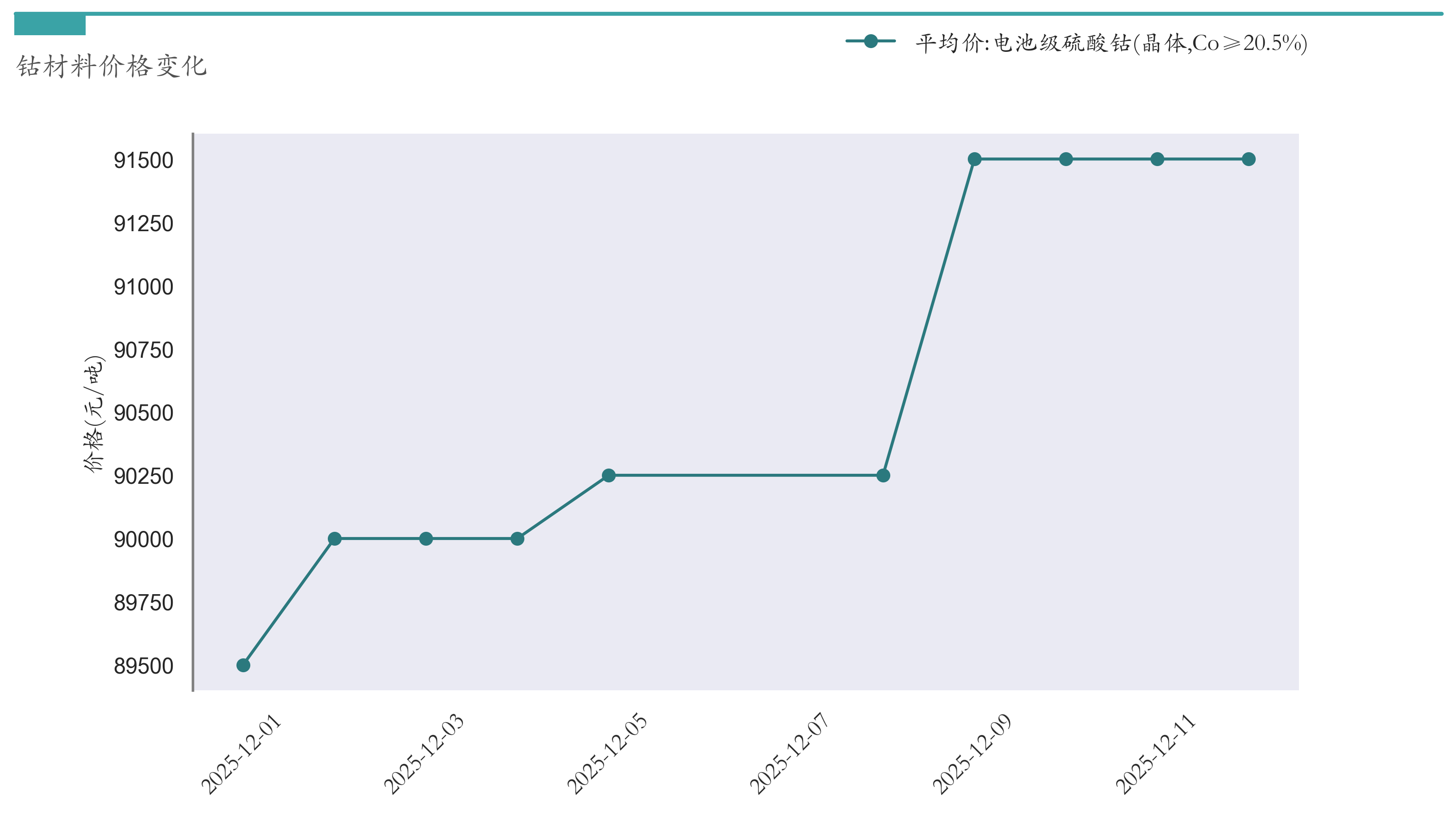 截至12月12日,电池级硫酸钴平均报价为91500元/吨,较12月5日上涨1250元/吨。近两周钴材料价格变化如下图所示:
