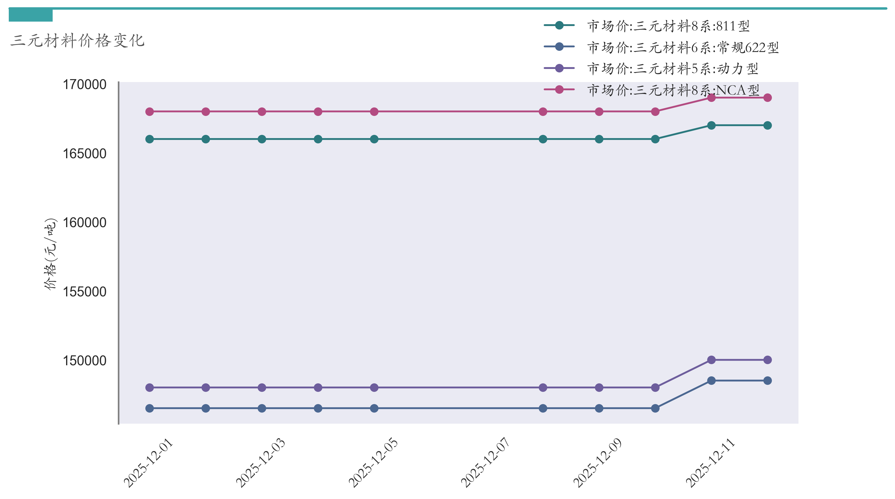 截至12月12日,三元材料8系:811型市场报价为167000元/吨,较12月5日上涨1000元/吨。三元材料8系:NCA型市场报价为169000元/吨,较12月5日上涨1000元/吨。三元材料6系:常规622型市场报价为148500元/吨,较12月5日上涨2000元/吨。三元材料5系:动力型市场报价为150000元/吨,较12月5日上涨2000元/吨。近两周三元材料价格变化如下图所示:
